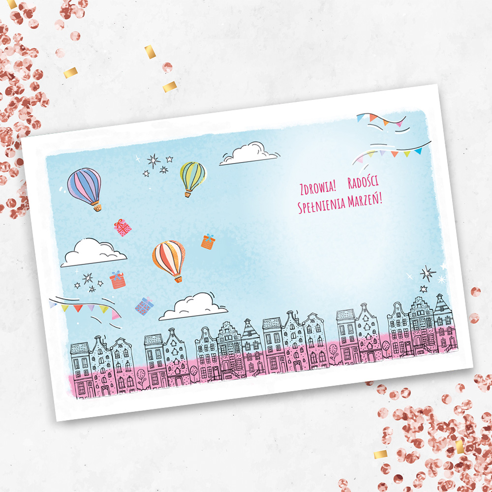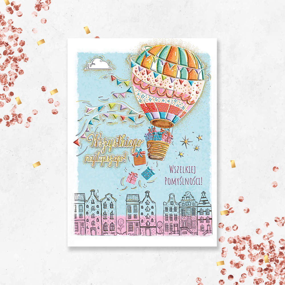 Karnet A5 BALON Z PREZENTAMI wydrukowany na wysokiej jakości papierze formatu A5. Karnet uszlachetniony złotą folią i tłoczeniem. W zestawie koperta.