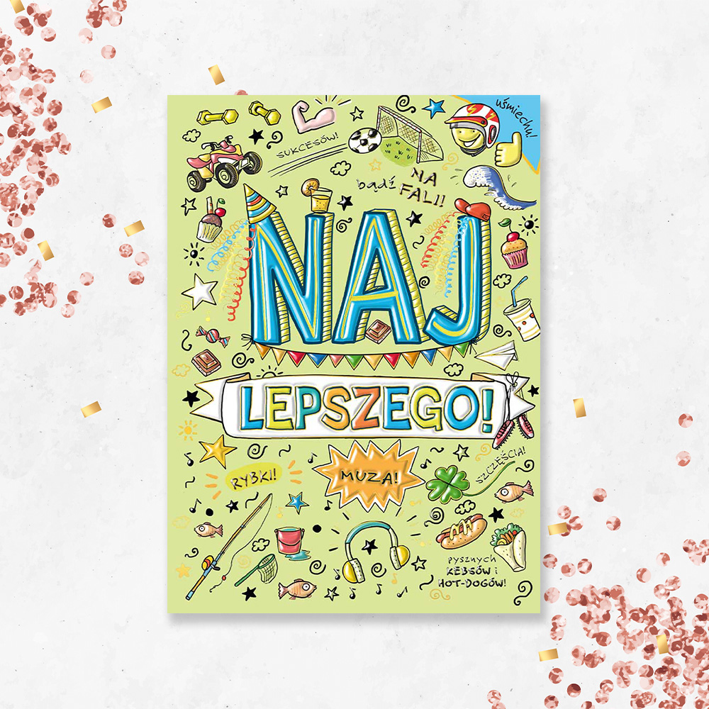 Karnet A5 CHŁOPAK NAJ wydrukowany na wysokiej jakości papierze formatu A5. Karnet uszlachetniony złotą folią i tłoczeniem. W zestawie koperta.