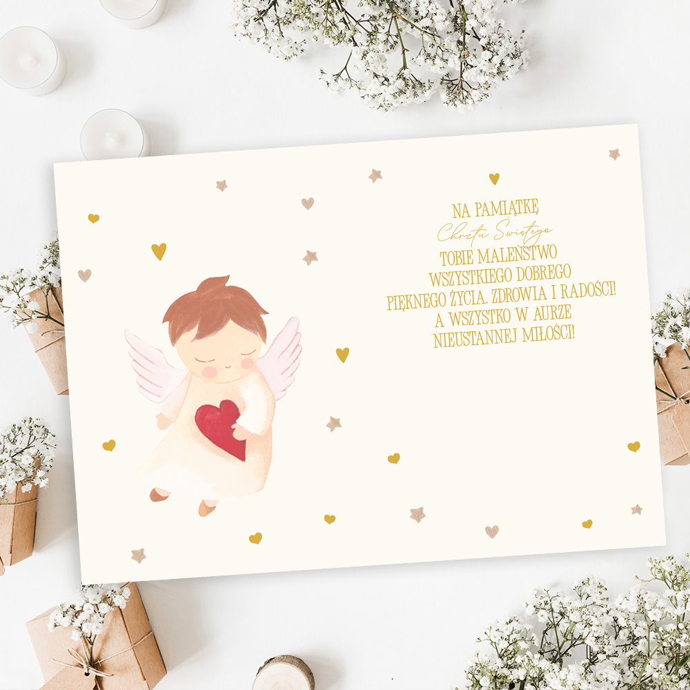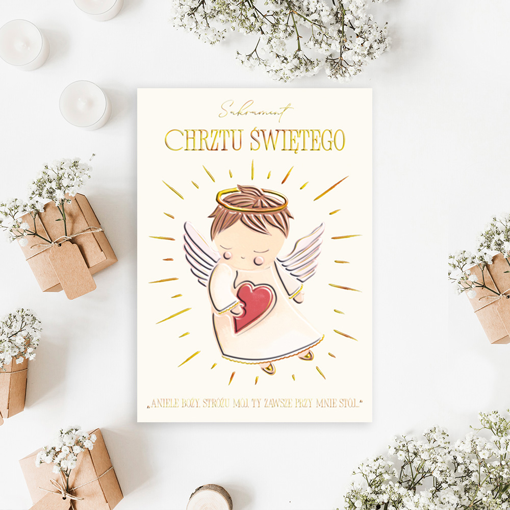 Karnet A5 CHRZEST ANIOŁ Z SERDUSZKIEM wydrukowany na wysokiej jakości papierze formatu A5. Karnet uszlachetniony złotą folią i tłoczeniem. W zestawie koperta.