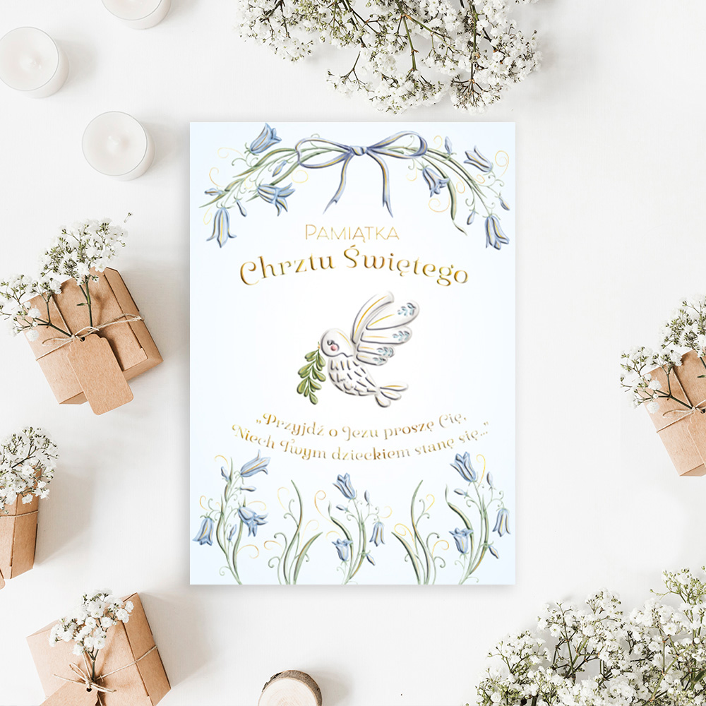 Karnet A5 CHRZEST GOŁĄBEK W KWIATACH DLA CHŁOPCA wydrukowany na wysokiej jakości papierze formatu A5. Karnet uszlachetniony złotą folią i tłoczeniem. W zestawie koperta.