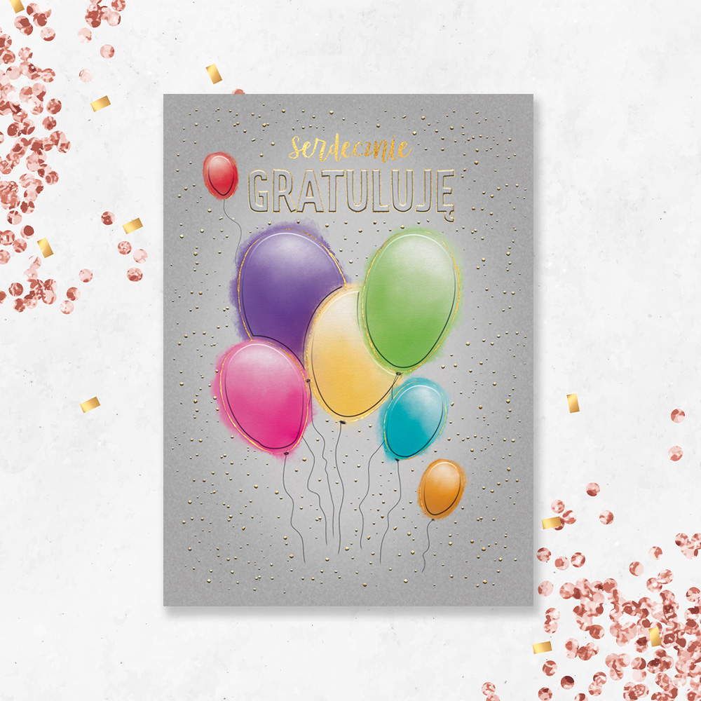 Karnet A5 GRATULUJĘ PĘK BALONÓW wydrukowany na wysokiej jakości papierze formatu A5. Karnet uszlachetniony złotą folią i tłoczeniem. W zestawie koperta.