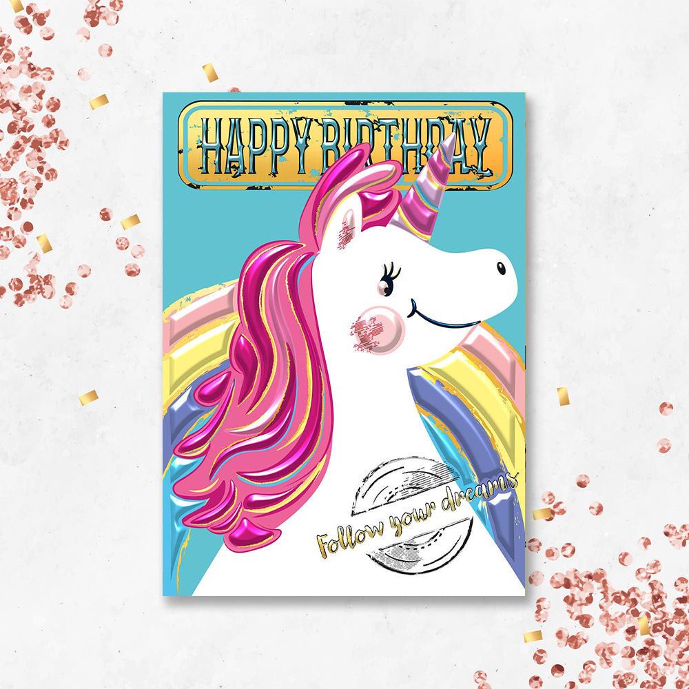 Karnet A5 JEDNOROŻEC NEW wydrukowany na wysokiej jakości papierze formatu A5. Karnet uszlachetniony złotą folią i tłoczeniem. W zestawie koperta.