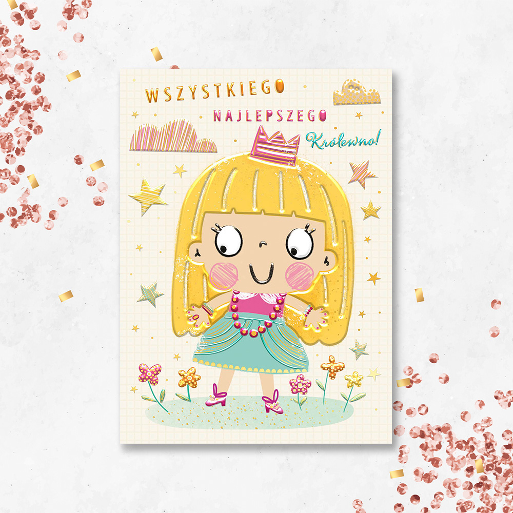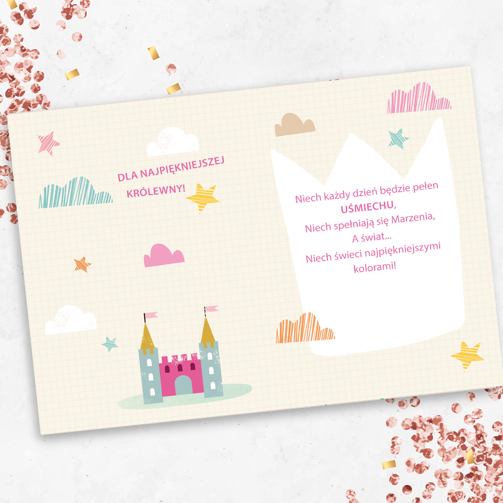 Karnet A5 KRÓLEWNA wydrukowany na wysokiej jakości papierze formatu A5. Karnet uszlachetniony złotą folią i tłoczeniem. W zestawie koperta.