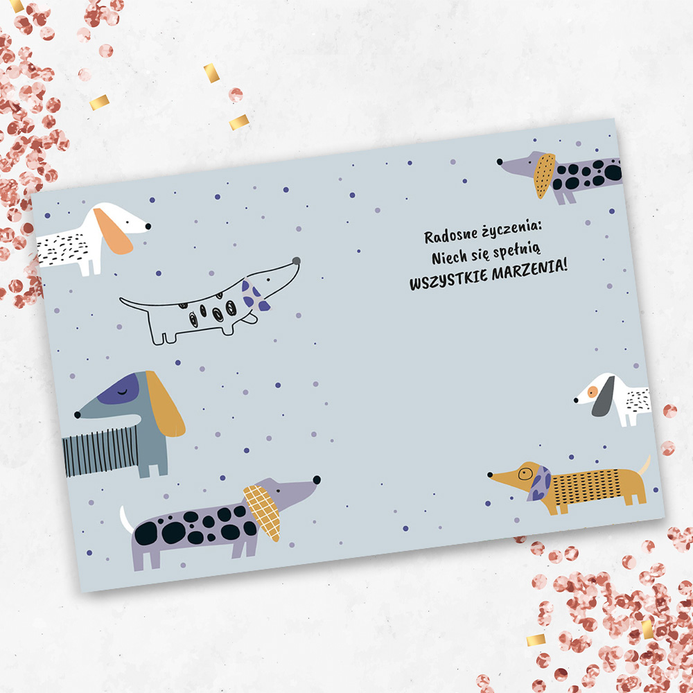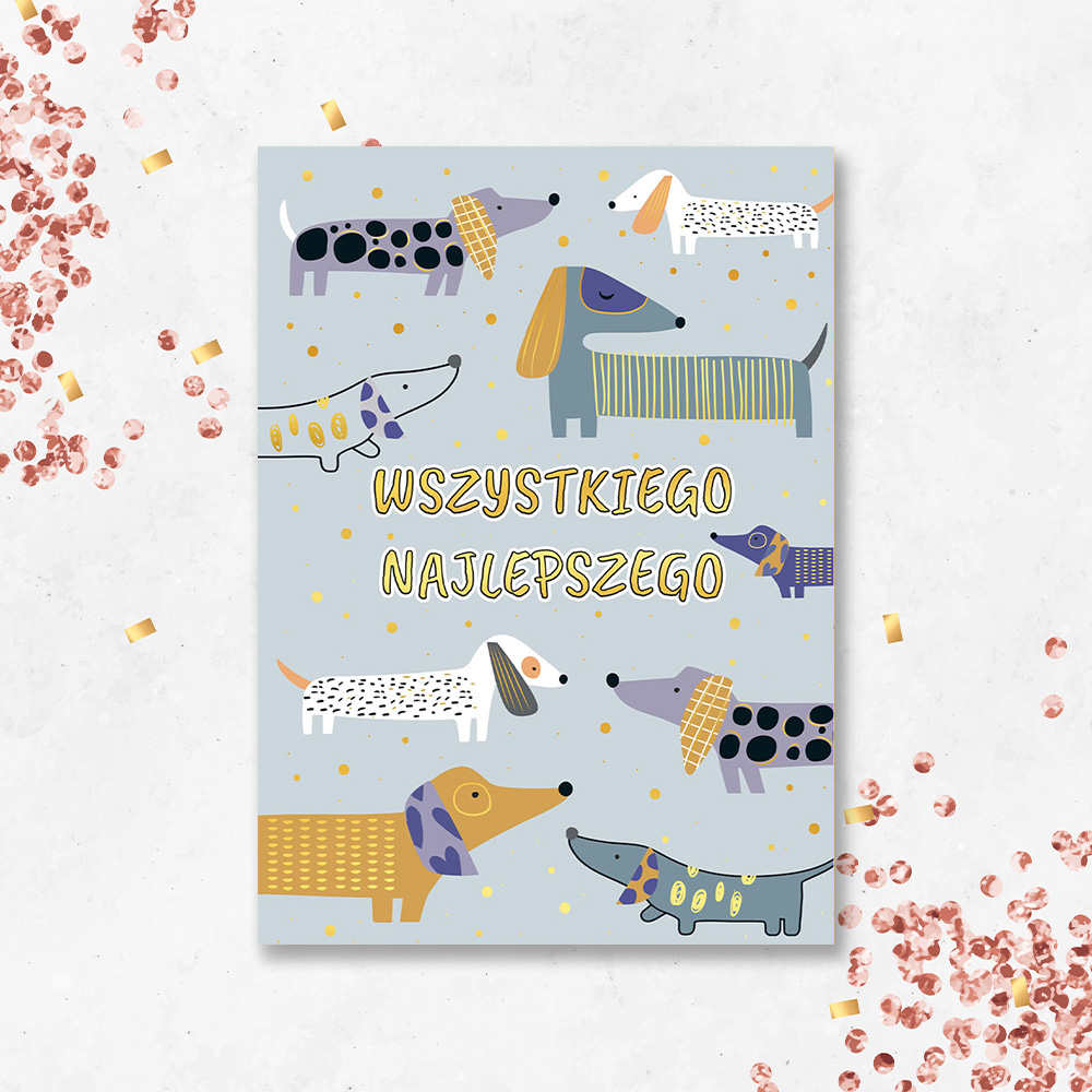 Karnet A5 SZARE PSY wydrukowany na wysokiej jakości papierze formatu A5. Karnet uszlachetniony złotą folią i tłoczeniem. W zestawie koperta.