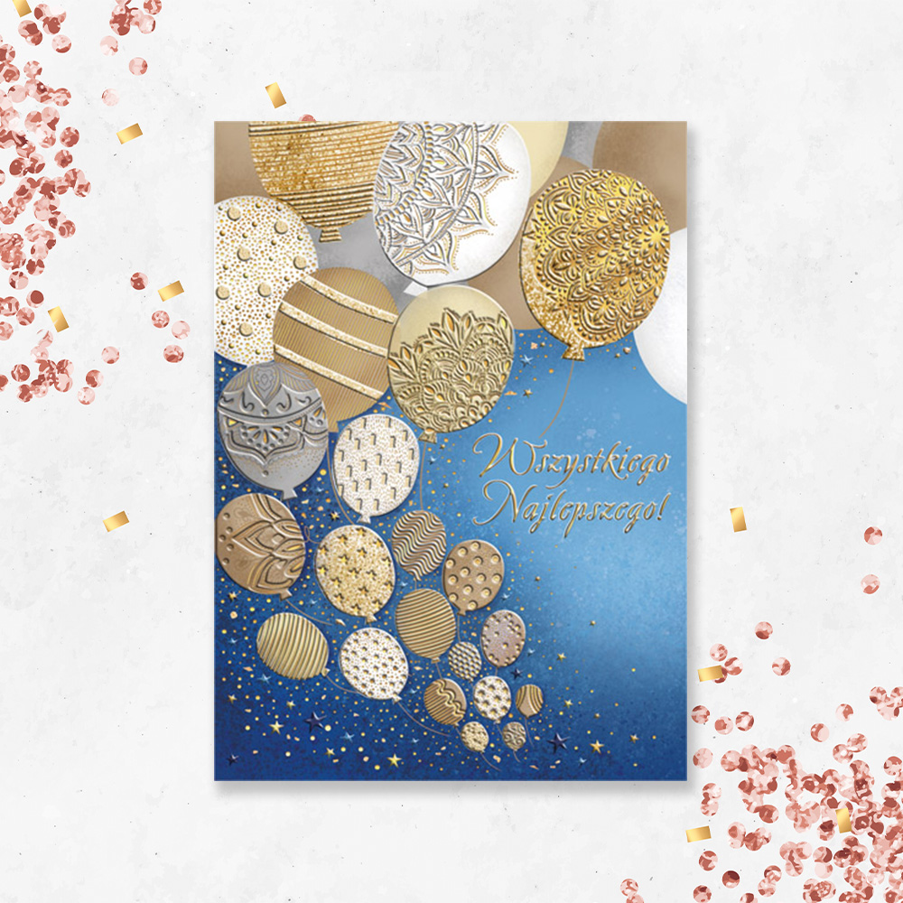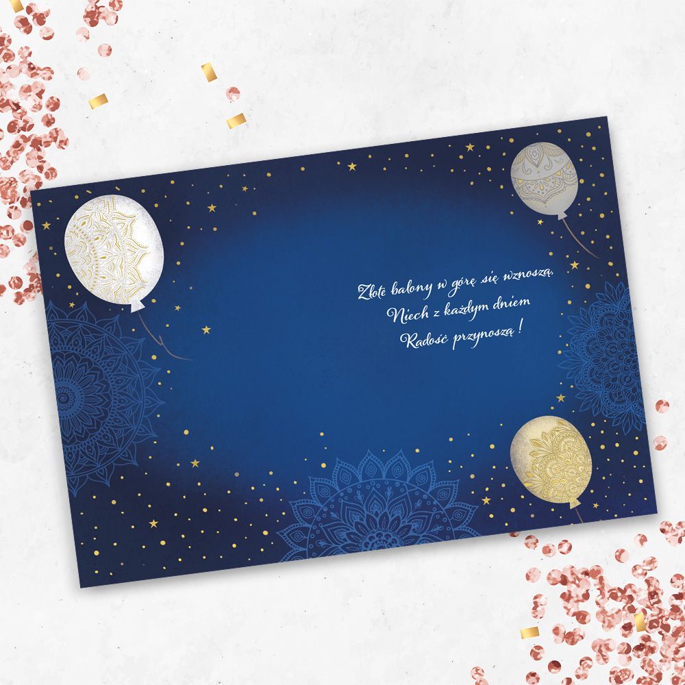 Karnet A5 ZŁOTE BALONY wydrukowany na wysokiej jakości papierze formatu A5. Karnet uszlachetniony złotą folią i tłoczeniem. W zestawie koperta.