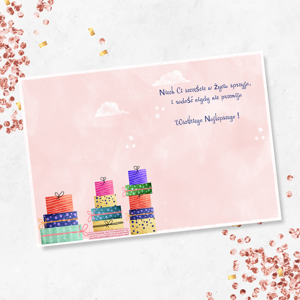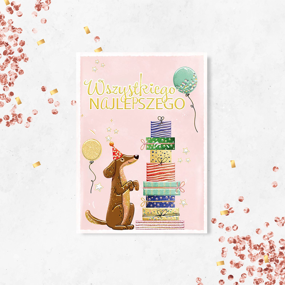 Karnet B6 JAMNIK Z PREZENTAMI wydrukowany na wysokiej jakości papierze formatu 15 x 15 uszlachetniony złotem i tłoczeniem. Ozdobne wycięcie po jednej stronie karnetu. W zestawie kolorowa koperta.
