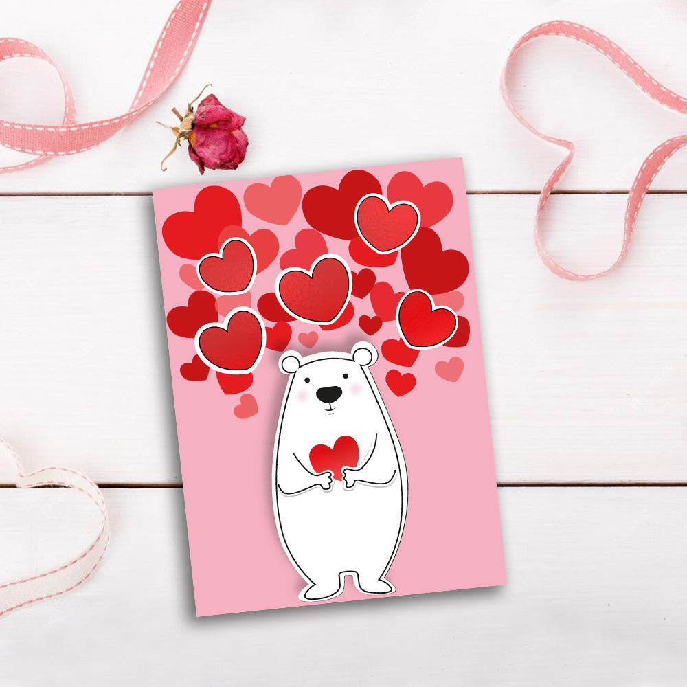 Karnet B6 Walentynki BIAŁY MIŚ wydrukowany na wysokiej jakości papierze formatu B6. Karnet uszlachetniony czerwoną folią. W zestawie kolorowa koperta.