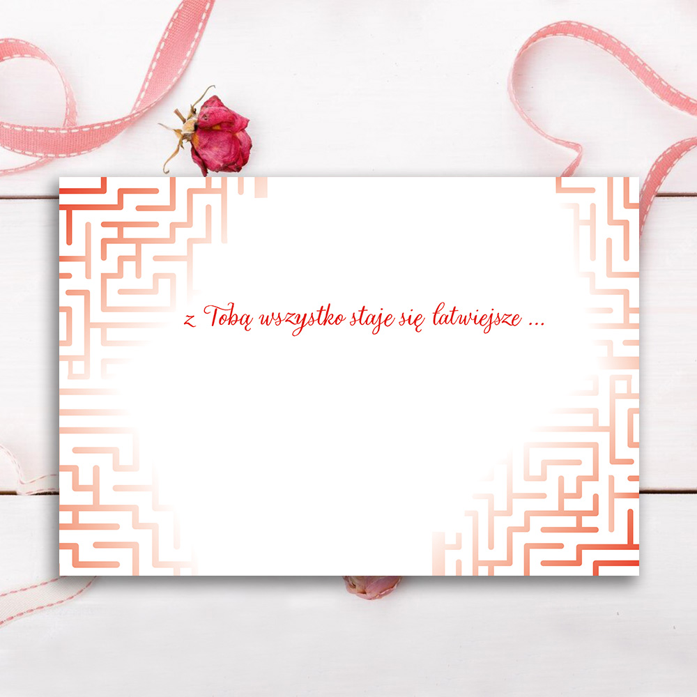 Karnet B6 Walentynki LABIRYNT wydrukowany na wysokiej jakości papierze formatu B6. Karnet uszlachetniony czerwoną folią. W zestawie kolorowa koperta.