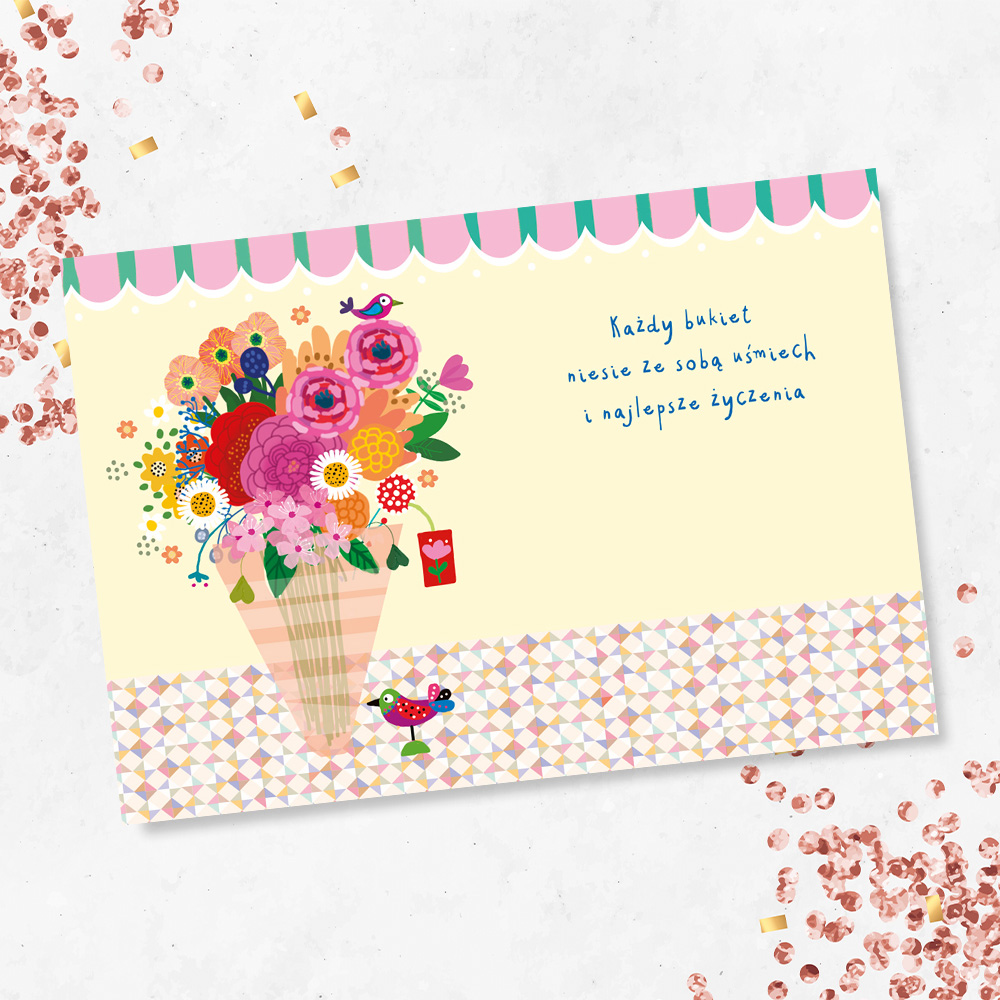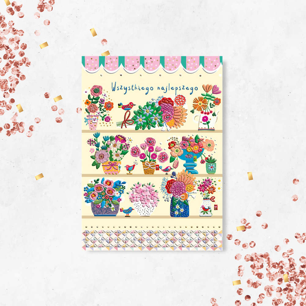 Karnet B6 WITRYNA KWIACIARNI wydrukowany na wysokiej jakości papierze formatu 15 x 15 uszlachetniony złotem i tłoczeniem. Ozdobne wycięcie po jednej stronie karnetu. W zestawie kolorowa koperta.