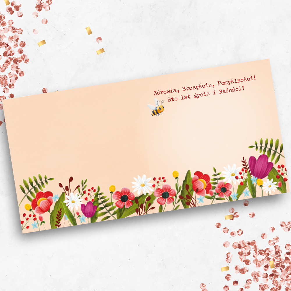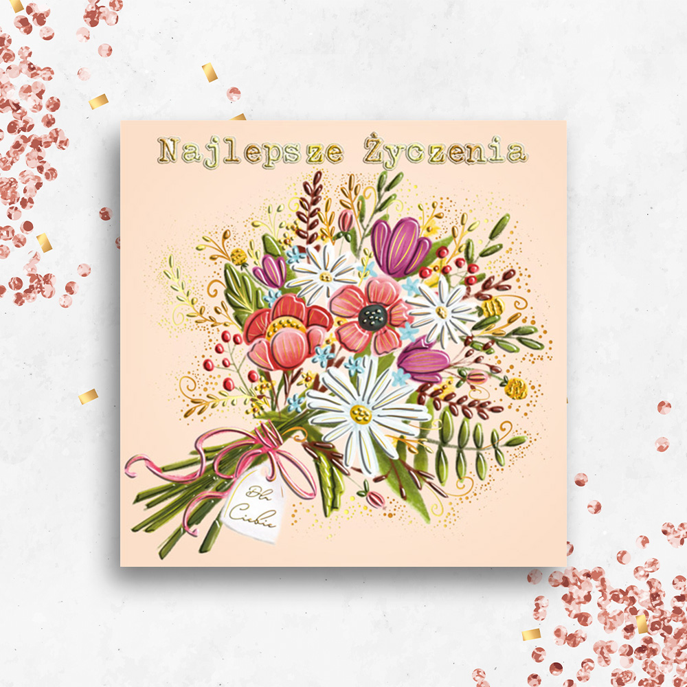 Karnet KW LETNI BUKIET wydrukowany na wysokiej jakości papierze formatu 15 x 15 uszlachetniony złotem i tłoczeniem. W zestawie kolorowa koperta.