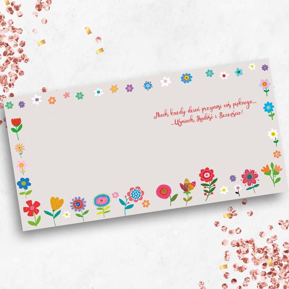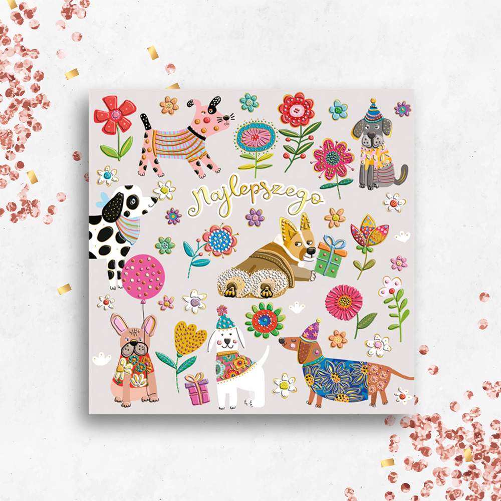 Karnet KW PIESKI W KWIATKACH wydrukowany na wysokiej jakości papierze formatu 15 x 15 uszlachetniony złotem i tłoczeniem. W zestawie kolorowa koperta.