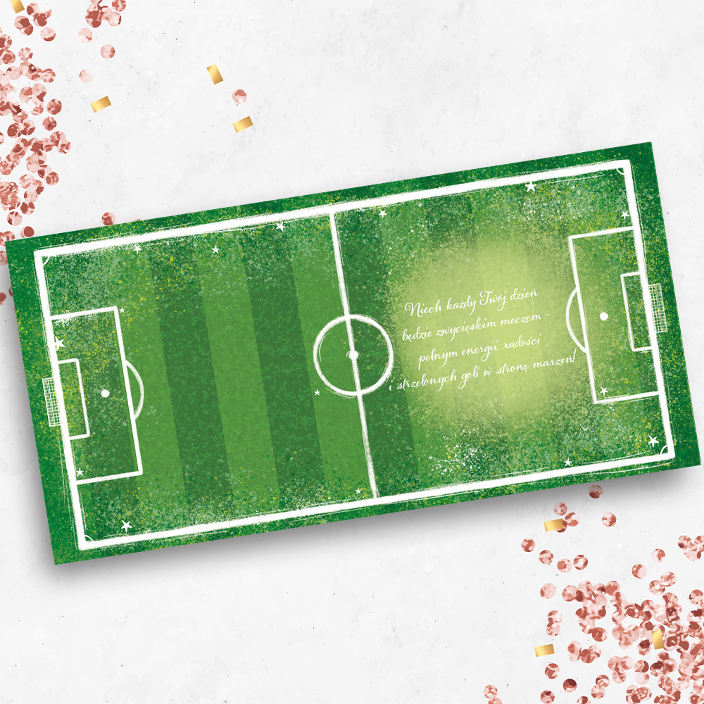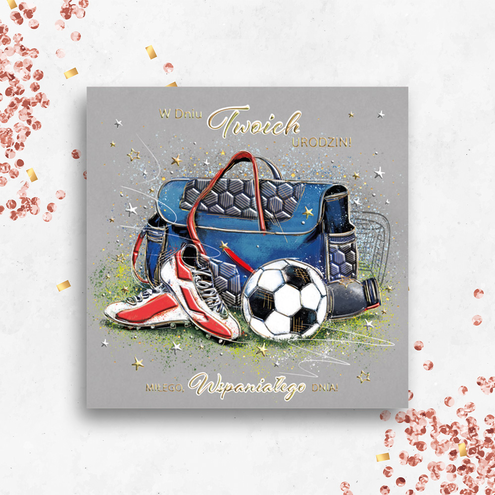 Karnet KW SPORTOWA wydrukowany na wysokiej jakości papierze formatu 15 x 15 uszlachetniony złotem i tłoczeniem. W zestawie kolorowa koperta.