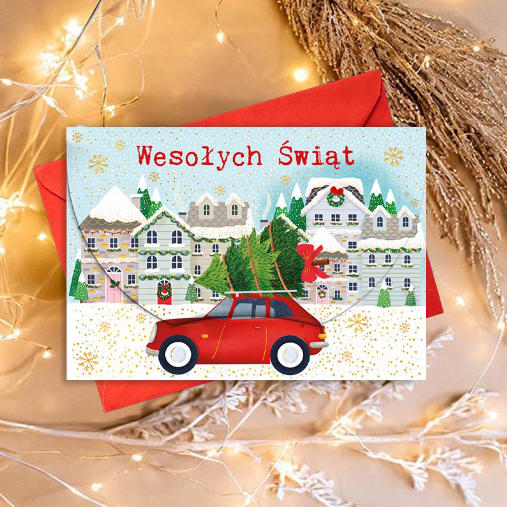 Karnet na kasę AUTO Z CHOINKĄ wydrukowany na wysokiej jakości papierze formatu B6. Karnet uszlachetniony złotem. W środku tekst życzeń. W zestawie czerwona koperta.