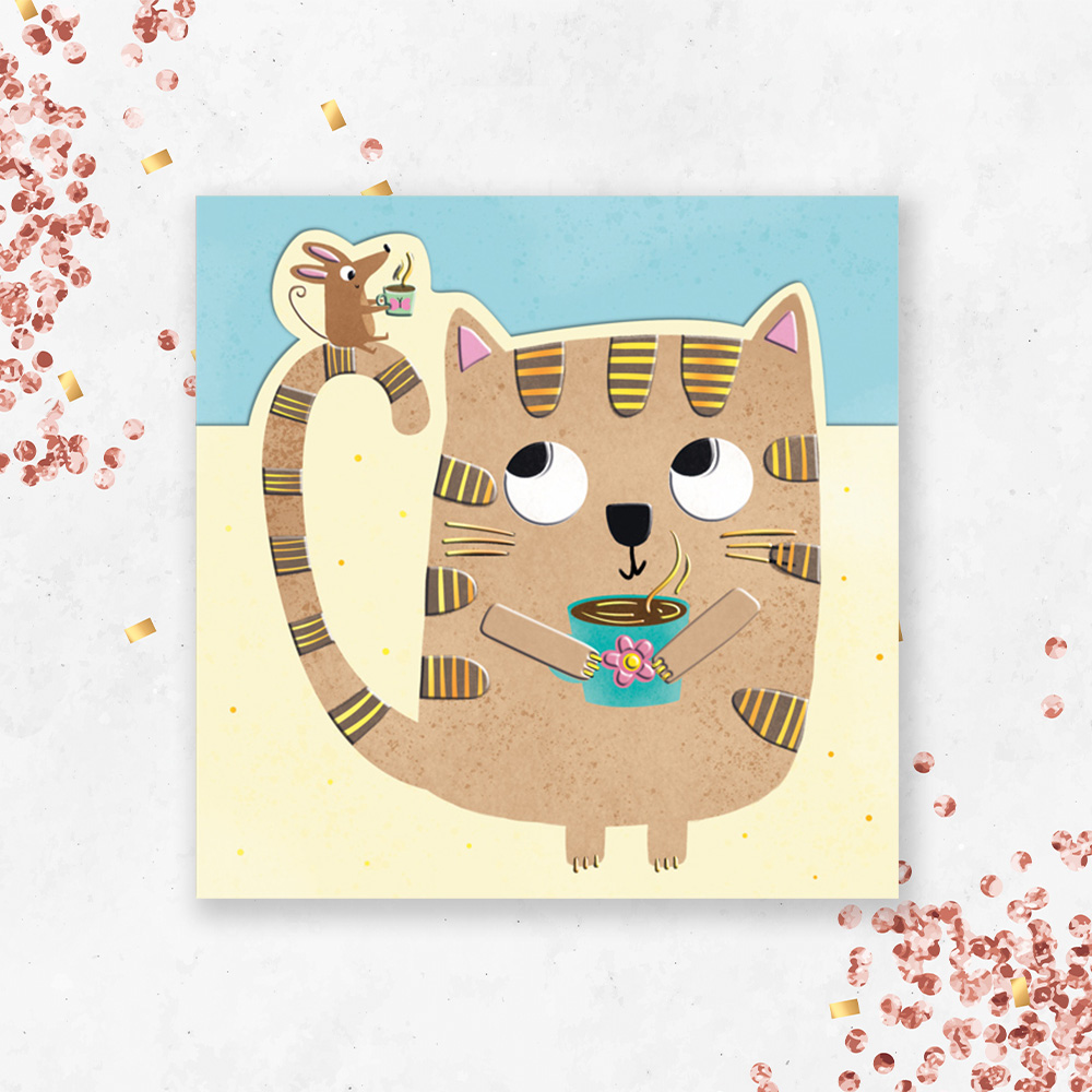 Karnet wycinany KW KOT Z MYSZKĄ wydrukowany na wysokiej jakości papierze formatu 15 x 15 uszlachetniony złotem i tłoczeniem. Ozdobne wycięcie po jednej stronie karnetu. W zestawie kolorowa koperta.