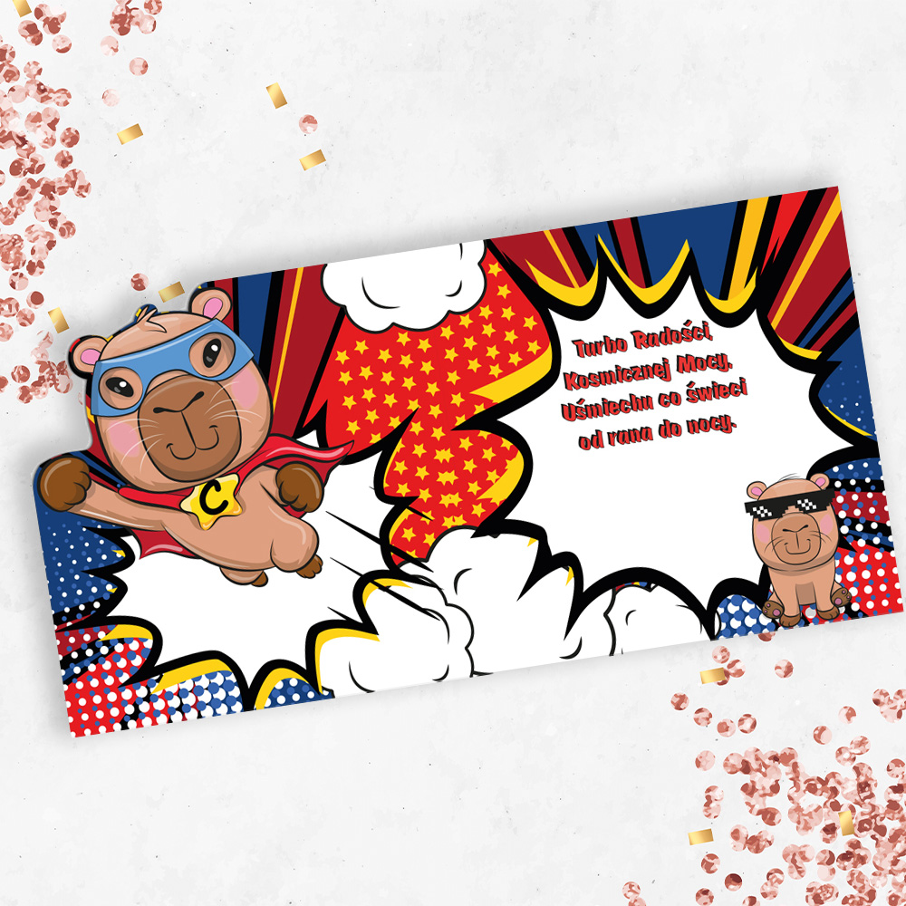 Karnet wycinany KW SUPER KAPIBARA wydrukowany na wysokiej jakości papierze formatu 15 x 15 uszlachetniony złotem i tłoczeniem. Ozdobne wycięcie po jednej stronie karnetu. W zestawie kolorowa koperta.
