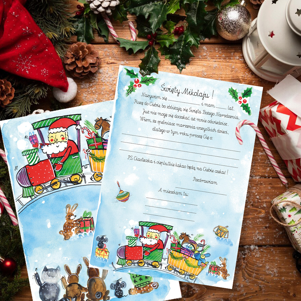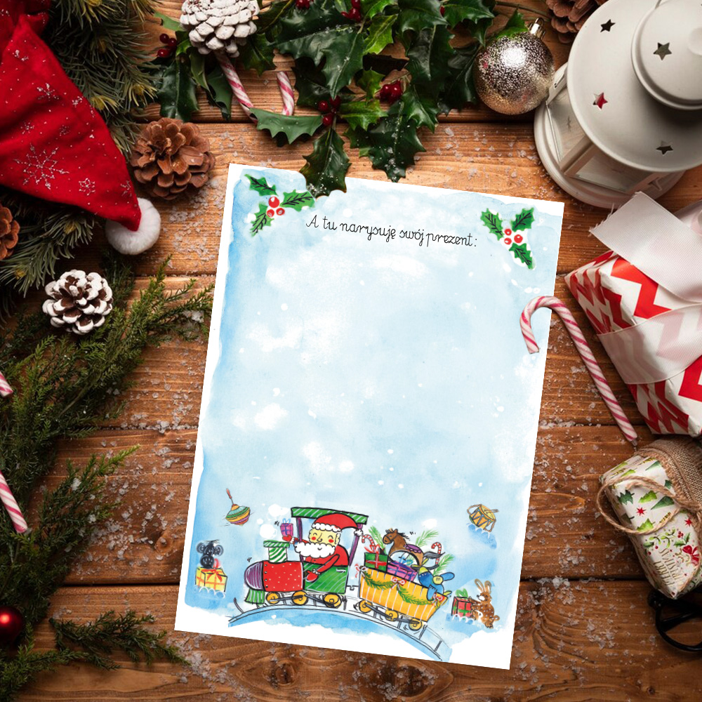 List do Mikołaja MIKOŁAJ Z PREZENTAMI wydrukowany na wysokiej jakości papierze. Produkt składa się z dwóch kartek. Pierwsza kartka do uzupełnienia listu, a druga do namalowania swojego wymarzonego prezentu.