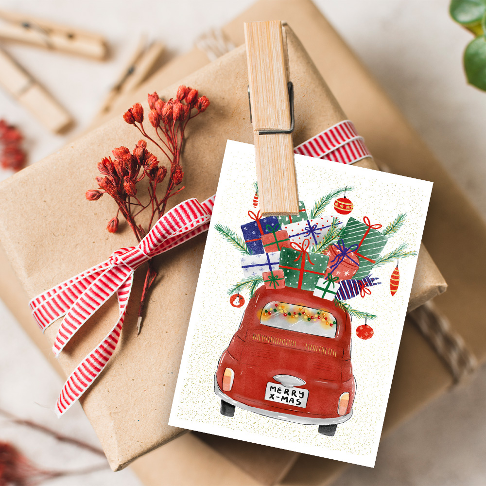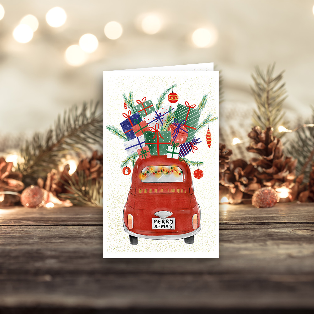 MINI Karnet AUTO w formacie 11,6 x 8,1 cm, złożony 5,8 x 8,1 cm. Wydrukowany na wysokiej jakości papierze, uszlachetniony złotem. Mini karnet  z grafiką w środku. Zamknięty w woreczek foliowy z kopertą.