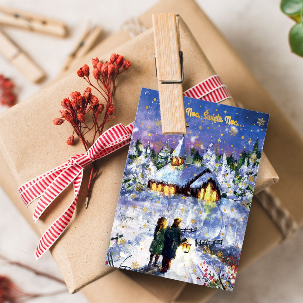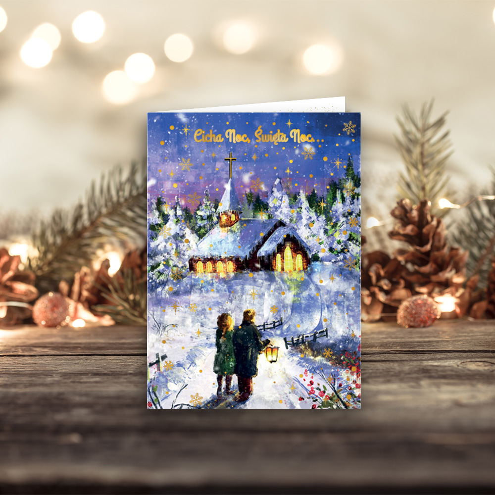 MINI Karnet KOŚCIÓŁ CICHA NOC w formacie 11,6 x 8,1 cm, złożony 5,8 x 8,1 cm. Wydrukowany na wysokiej jakości papierze, uszlachetniony złotem. Mini karnet  z grafiką w środku. Zamknięty w woreczek foliowy z kopertą.