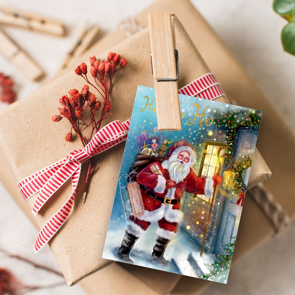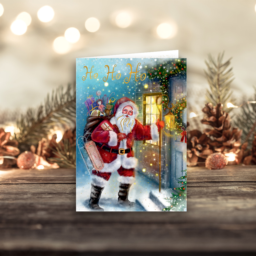 MINI Karnet MIKOŁAJ U DRZWI w formacie 11,6 x 8,1 cm, złożony 5,8 x 8,1 cm. Wydrukowany na wysokiej jakości papierze, uszlachetniony złotem. Mini karnet  z grafiką w środku. Zamknięty w woreczek foliowy z kopertą.