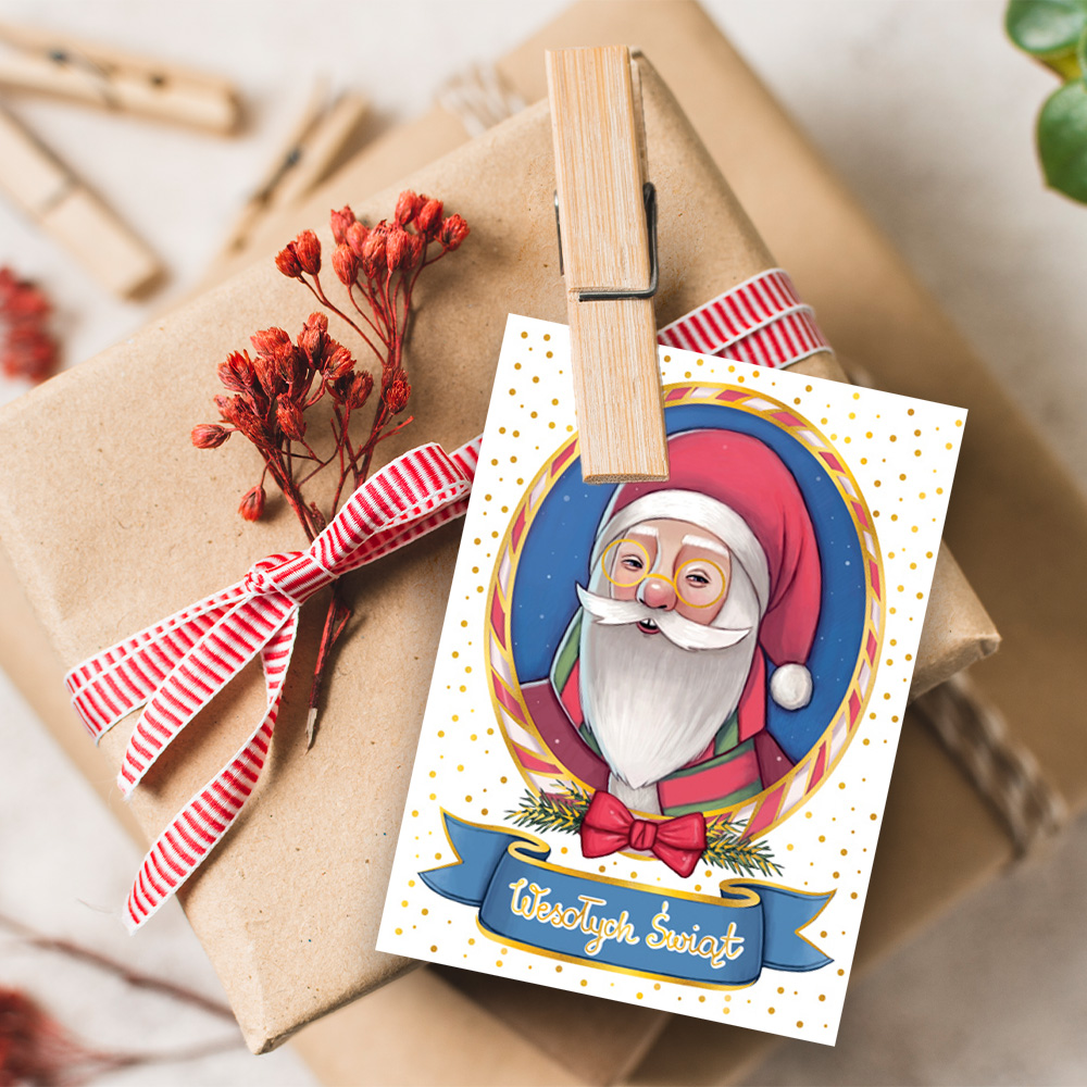 MINI Karnet MIKOŁAJ W KÓŁKU w formacie 11,6 x 8,1 cm, złożony 5,8 x 8,1 cm. Wydrukowany na wysokiej jakości papierze, uszlachetniony złotem. Mini karnet  z grafiką w środku. Zamknięty w woreczek foliowy z kopertą.