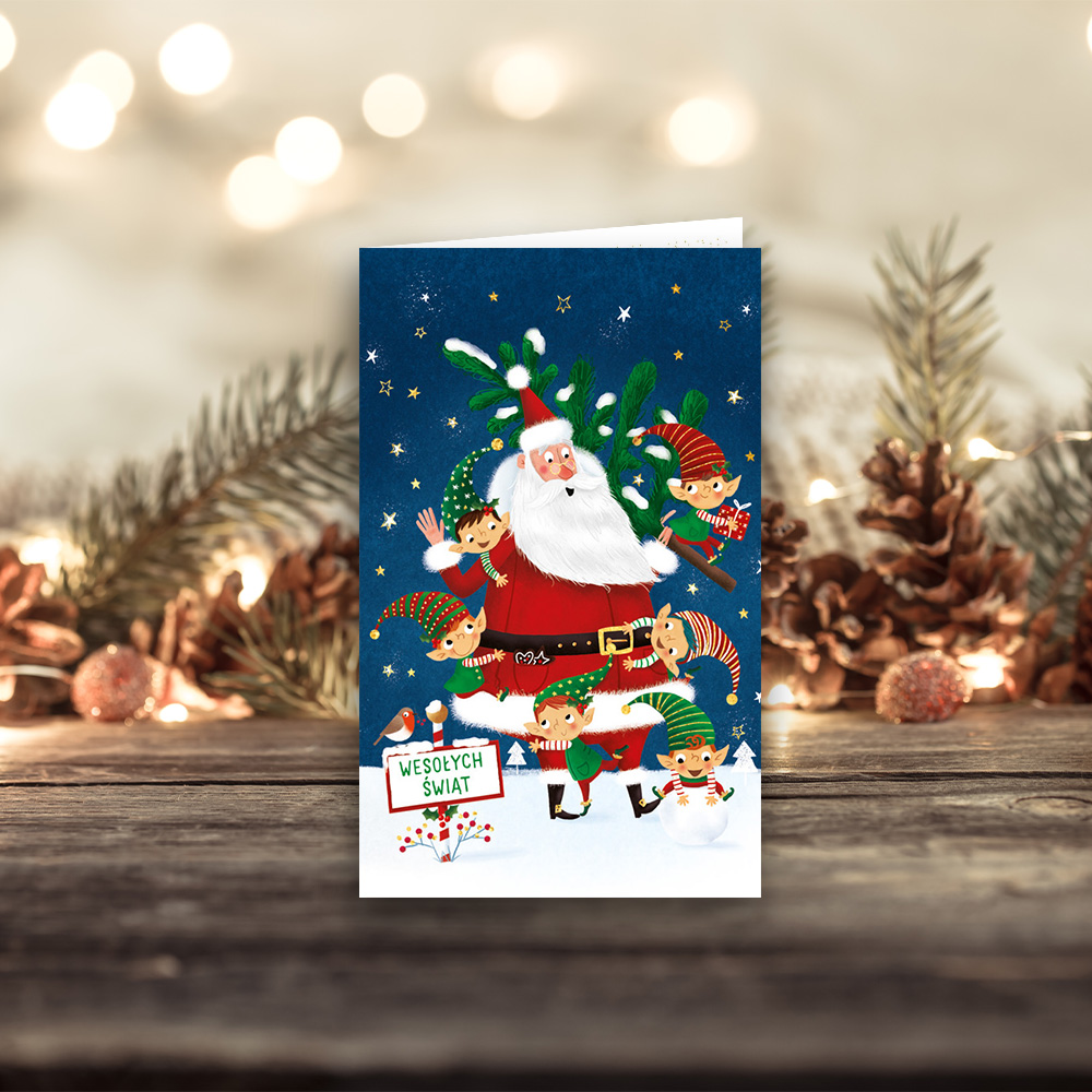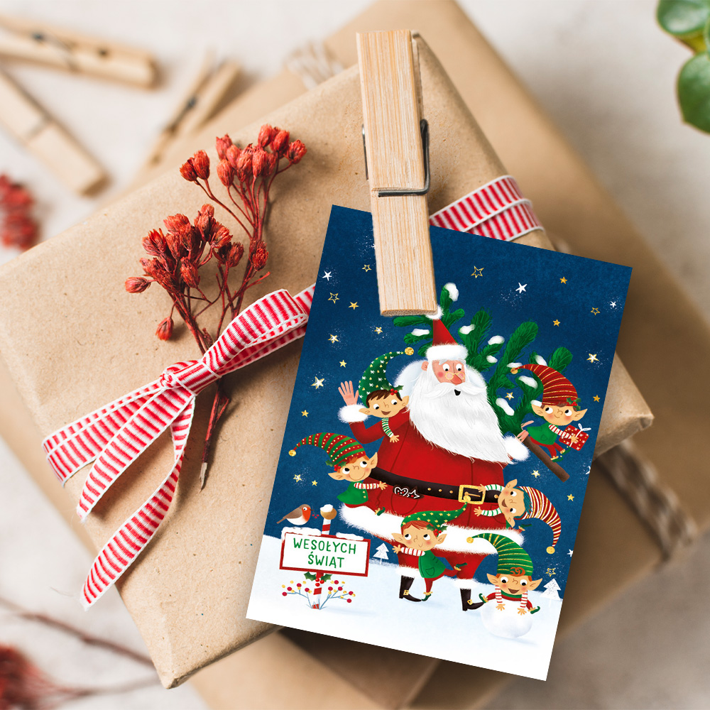 MINI Karnet MIKOŁAJ Z ELFAMI w formacie 11,6 x 8,1 cm, złożony 5,8 x 8,1 cm. Wydrukowany na wysokiej jakości papierze, uszlachetniony złotem. Mini karnet  z grafiką w środku. Zamknięty w woreczek foliowy z kopertą.