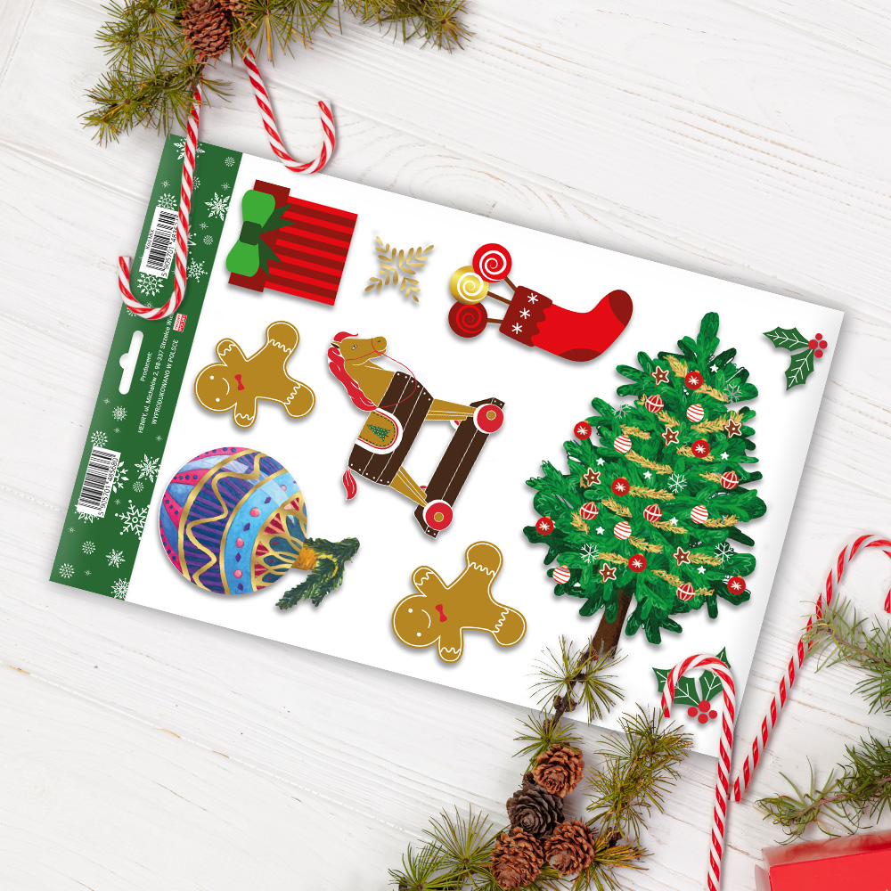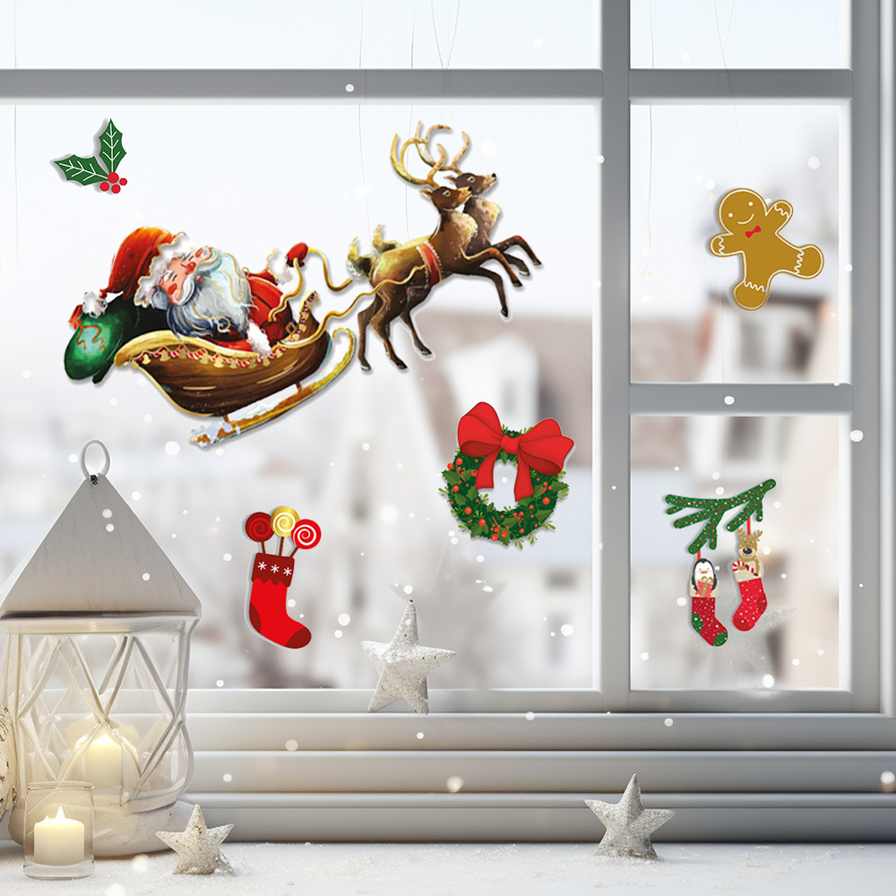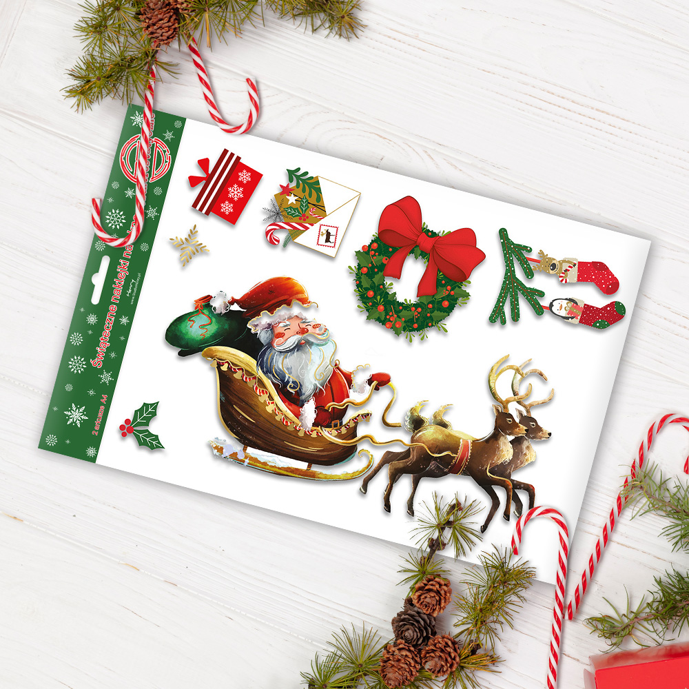 Naklejki elektrostatyczne na okno MIKOŁAJ W ZAPRZĘGU w formacie A4, dwa arkusze naklejek. Aż 17 naklejek różnych wielkości.