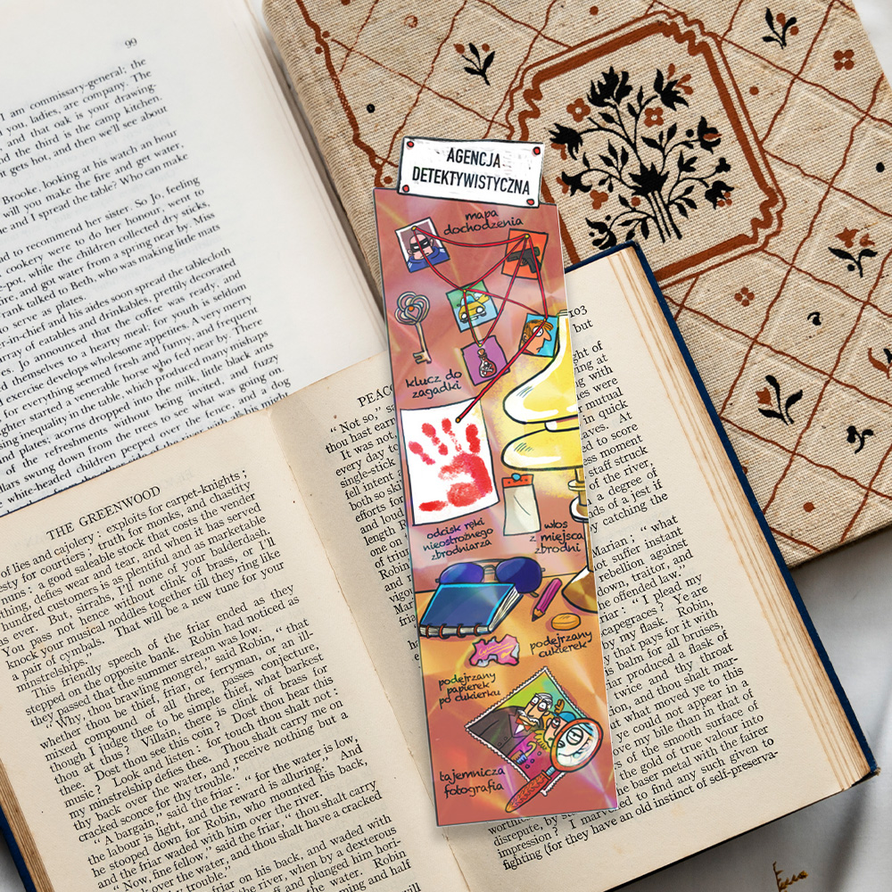 Zakładka fabularna AGENCJA jest to uniwersalna, praktyczna i gruba zakładka do książki. Zakładka dwustronna z grafiką i historyjką. Uszlachetniana folią soczewkową