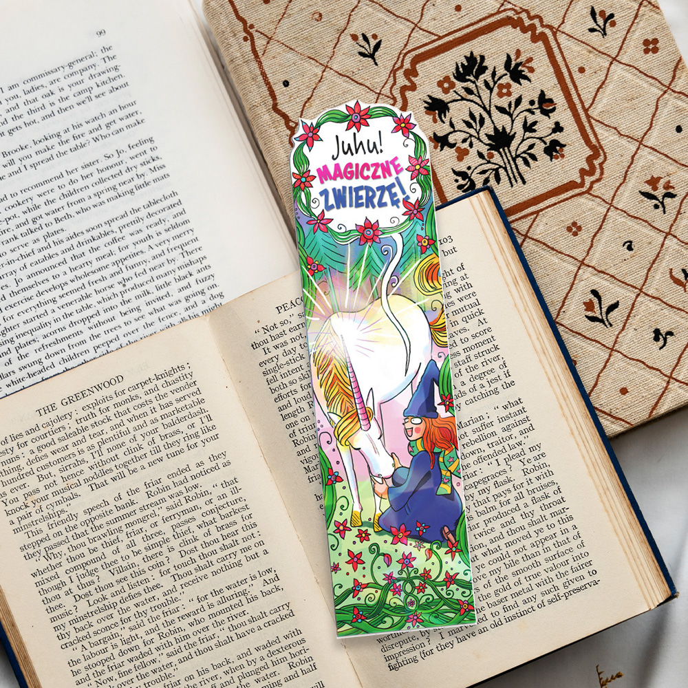 Zakładka fabularna JUHU jest to uniwersalna, praktyczna i gruba zakładka do książki. Zakładka dwustronna z grafiką i historyjką. Uszlachetniana folią soczewkową